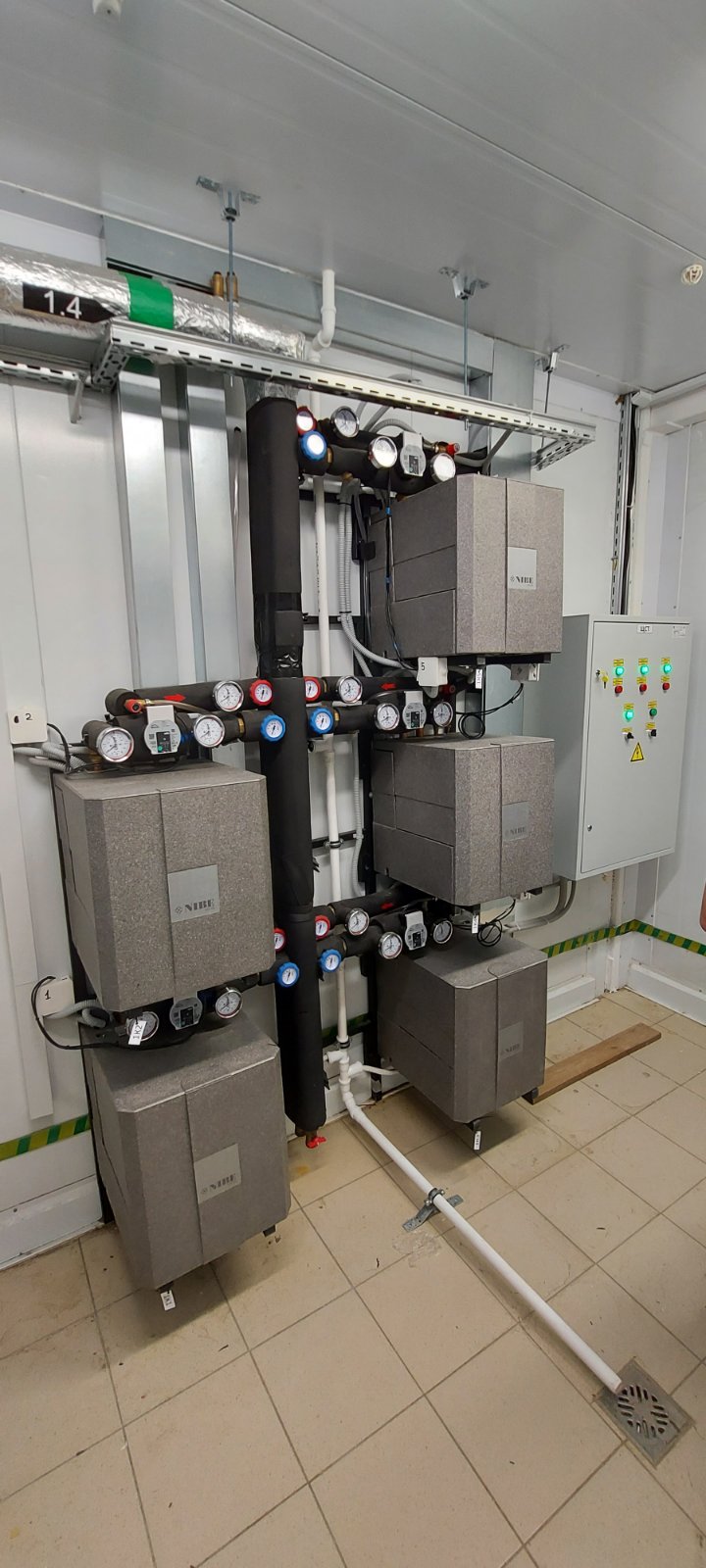 Предлагаемым решением предусматривается применение тепловых насосов «воздух-вода» в качестве основного источника тепло-, холодоснабжения для нужд кондиционирования, поддержания микроклимата. Для снижения затрат на оплату потребляемой торговым объектом электроэнергии предусмотрена крышная сетевая фотоэлектрическая станция мощностью 47 кВт.