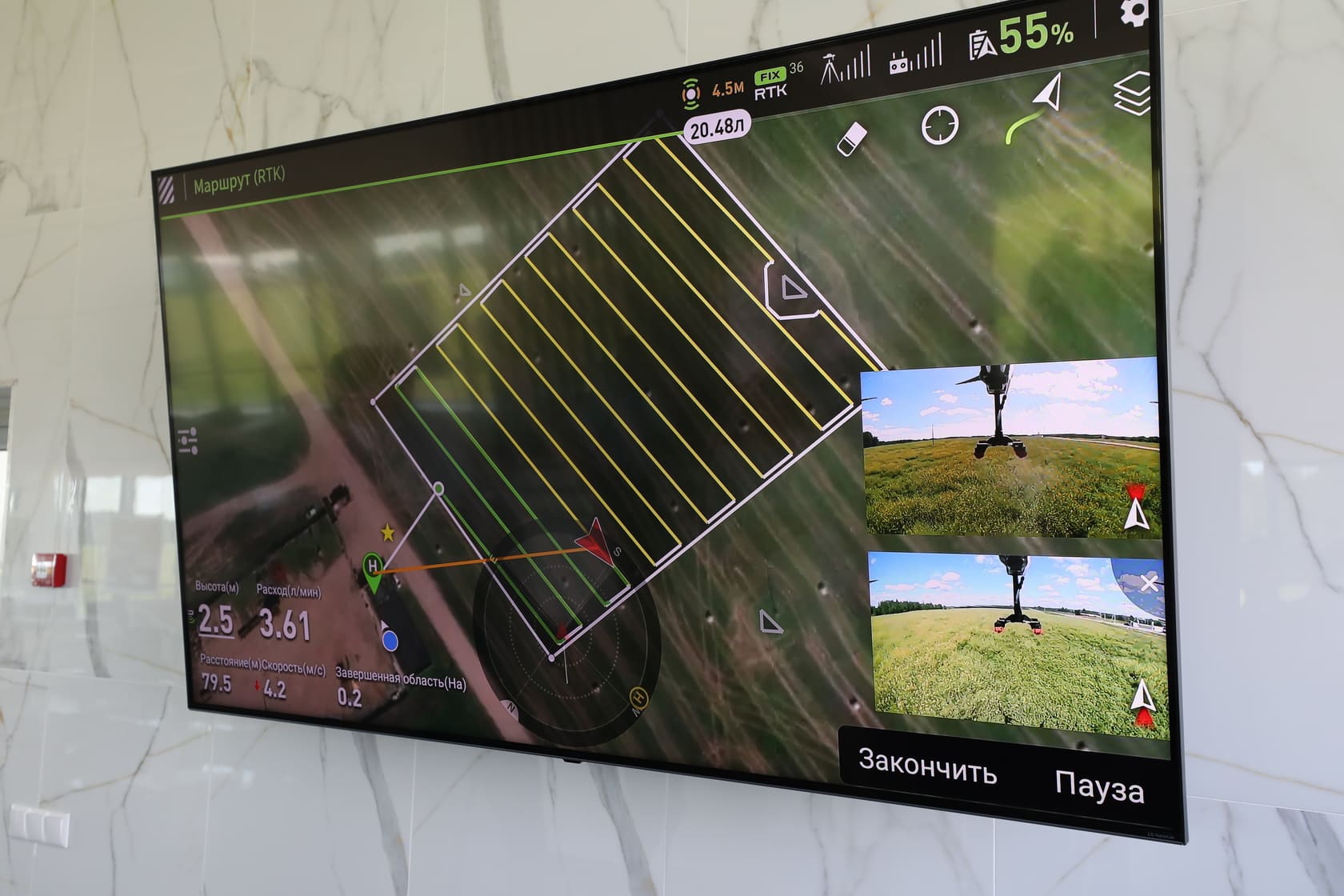 Благодаря созданной дроном-разведчиком карте агроном видит ситуацию на поле и на основе этой информации принимает решение о дозе распыляемого средства, составляет полетное задание. Дрон разбивает поле на пятиметровые квадраты и распыляет средство в соответствии с заданными параметрами. Он летит над всем полем равномерно в любое время суток и регулирует подачу средства в зависимости от задания.