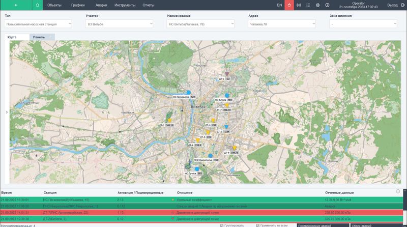 В процессе реализации и внедрения системы управления городским водоснабжением «Акватория» г.Витебск (филиал «Витебскводоканал» УП «Витебскоблводоканал) в начале 2023 года были решены следующие технологические задачи с целью оптимизации режимов работы и повышения эффективности: