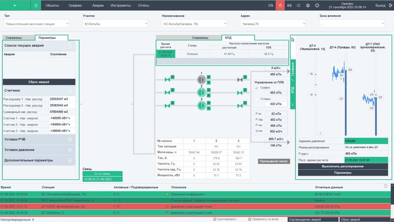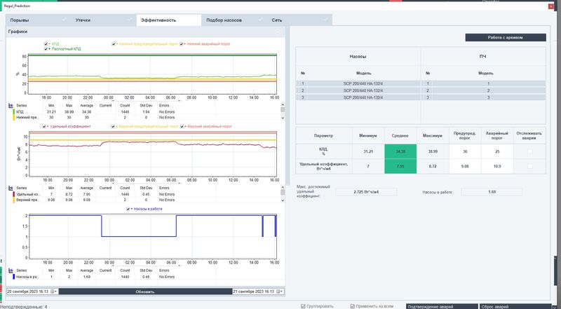 Система непрерывно рассчитывает и сравнивает показатели эффективности работы насосных станций: КПД и коэффициент удельных затрат.