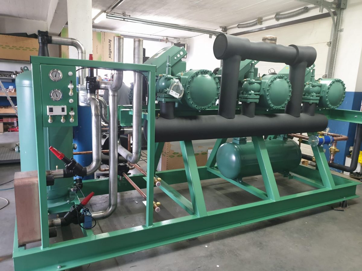 Система хладоснабжения с температурой 40%-го раствора пропиленгликоля минус 3°C/ плюс 2°C (схема с промежуточным охлаждением, холодильный агент R717) предназначена для подачи в чиллер ледяной воды и в приточно-вытяжные установки цеха глубокой переработки овощей.